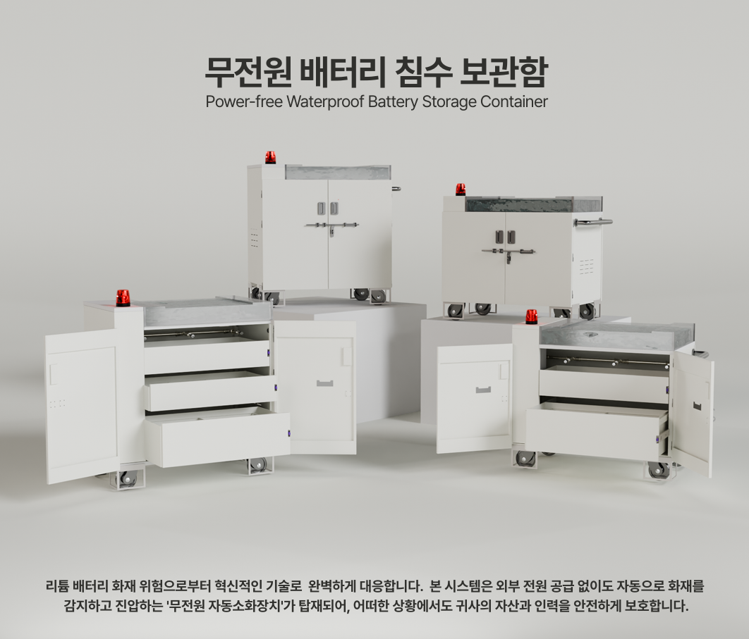 외부 전력 없이 기계식으로 즉시 소화수를 방출하고 발화 배터리를 100% 완전 수몰시켜 재발화를 원천 차단하는 보관함입니다.